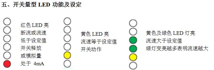 將流量開關(guān)裝好,使介質(zhì)以需要監(jiān)測的流速流動(dòng),擰開面板上的螺絲,調(diào)整電位計(jì), 使第一個(gè)綠色LED怡好變亮。此后當(dāng)流速低于當(dāng)前值時(shí),開關(guān)就釋放(紅燈亮)。若要使開關(guān)點(diǎn)比當(dāng)前流速小,可調(diào)整電位計(jì)(順時(shí)針旋轉(zhuǎn)螺絲刀)使綠色 LED多亮一些。